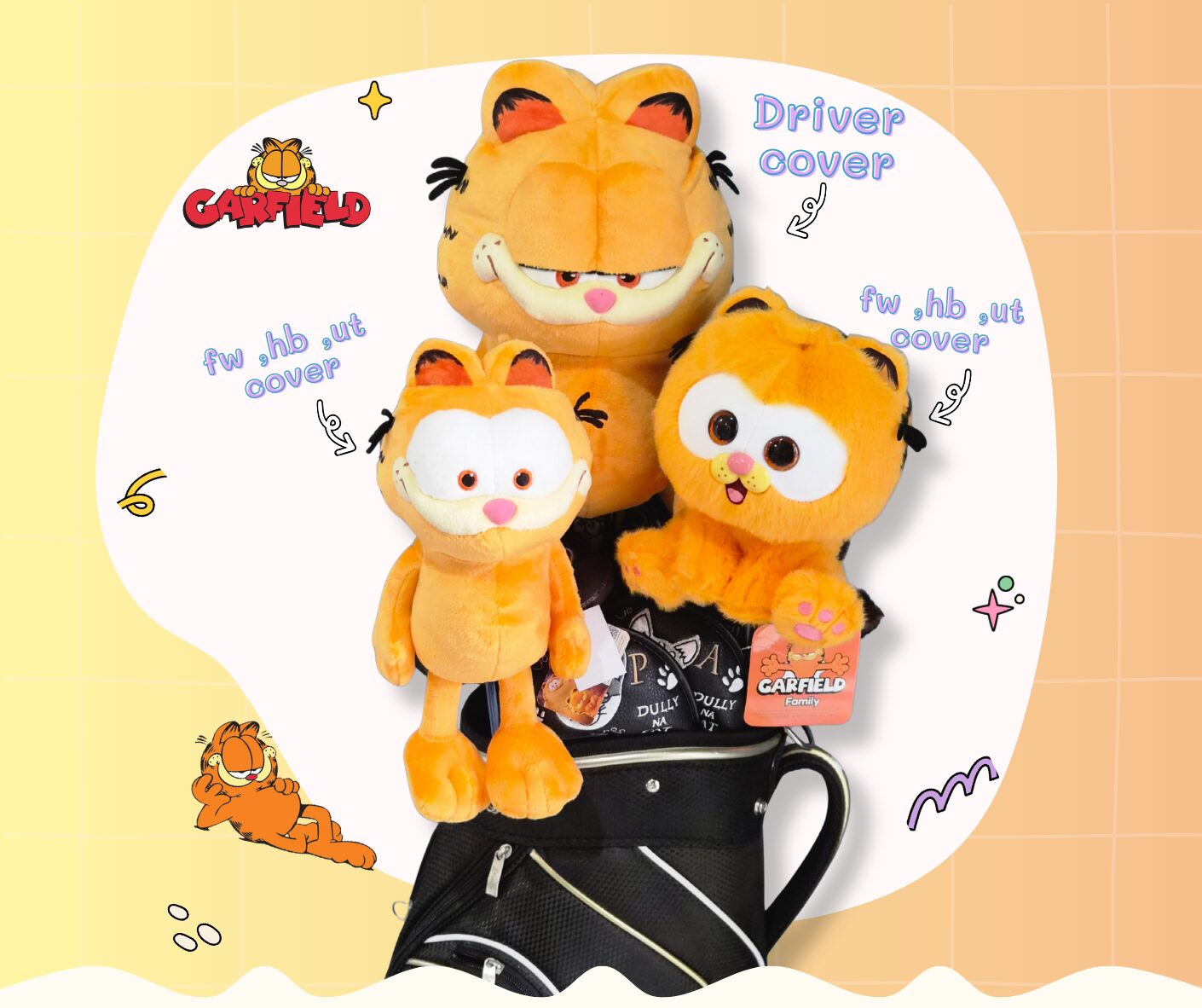 Set Headcover การ์ฟิลด์ (Garfield) แมวส้มจอมกวน – ลิขสิทธิ์แท้ สำหรับ Driver, Fairway, Hybrid, Ut cover