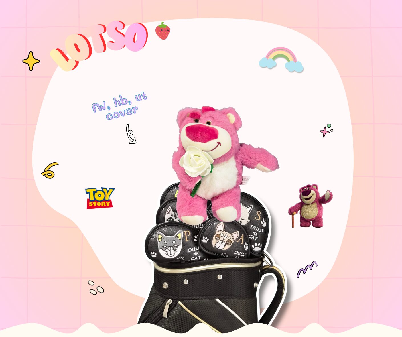 Headcover หมีลอทโซ่ (Lotso) สีชมพู – งานแฟชั่น หมีจอมกอดถือดอกกุหลาบ ขนนุ่ม สำหรับ Fairway, Hybrid, Ut cover